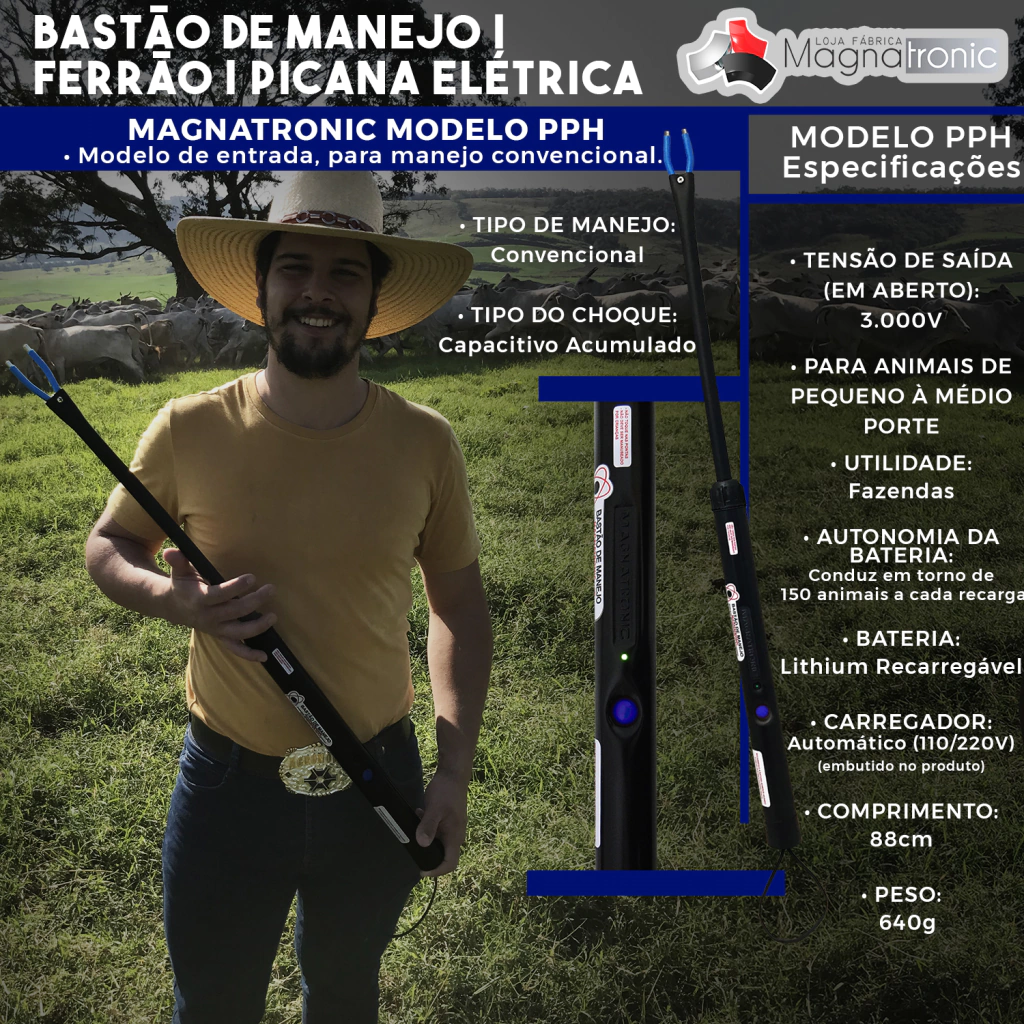 • Utilidade: A Picana Elétrica/Bastão de Manejo PPH Magnatronic® é um bastão elétrico que serve para facilitar o manejo de gado/suínos/outros, sendo utilizada por fazendeiros, veterinários, peões, capatazes,etc. para movimentar o gado.